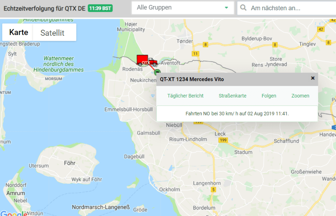 Das Fahrzeugortungssystem von Quartix zeichnet alle Fahrten eines jeden Fahrers mit Start-, End- und Leerlaufzeiten auf. Mit einem einfachen Klick können Sie die Fahrzeuge auf Google Street View anzeigen lassen, um eine ähnliche Ansicht wie Ihr Fahrer zu erhalten.