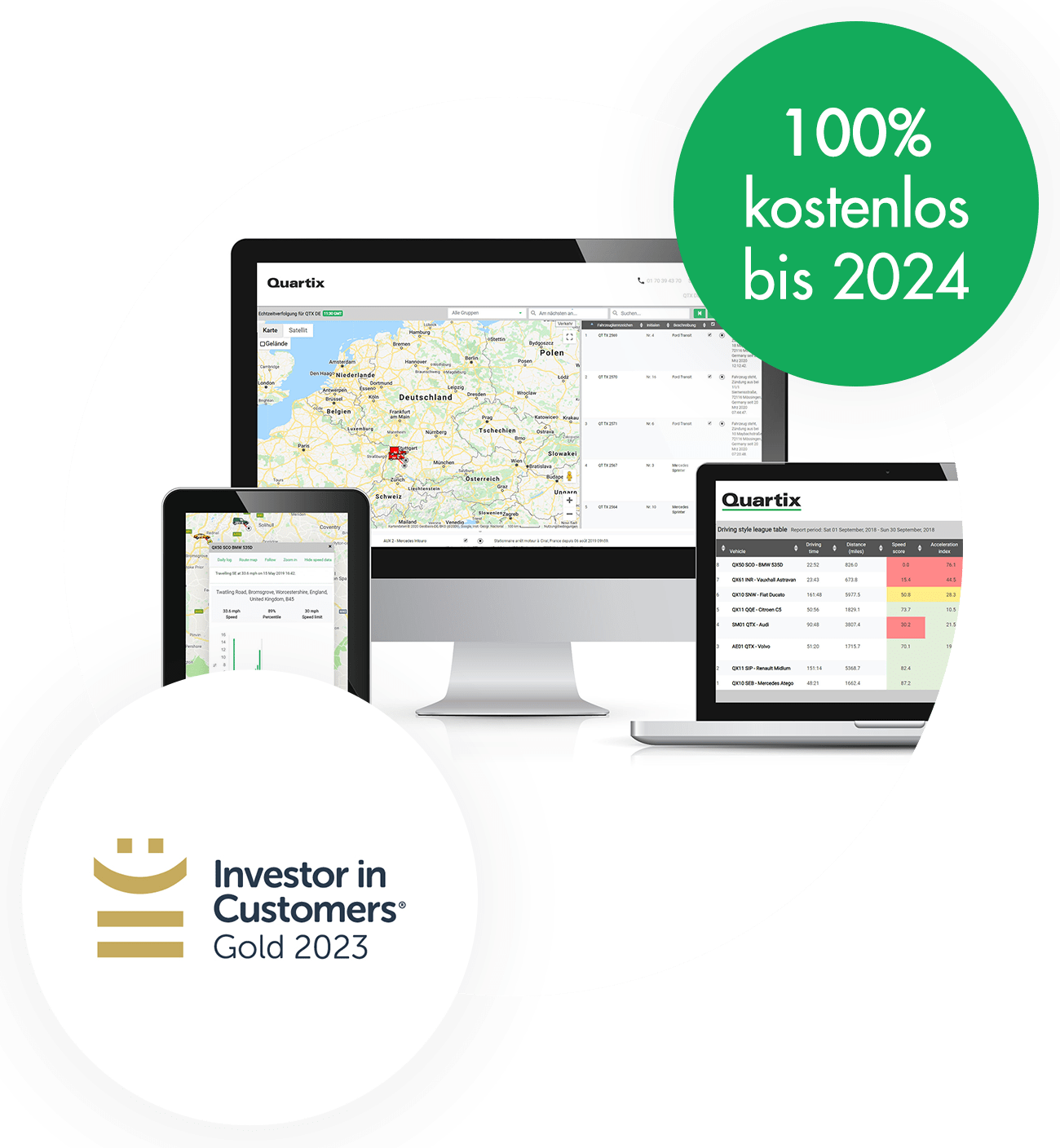 Und für den Rest des Jahres 2023… können Sie all dies kostenlos genießen. Erhalten Sie Informationen über Ihren gesamten Fuhrpark, wenn Sie einen neuen Vertrag mit dem Quartix Vehicle Tracking System abschließen, und zwar kostenlos bis Januar 2024.