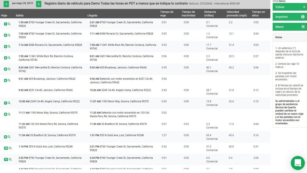 Identifique dónde se hicieron paradas y a qué hora se completaron los trabajos o las entregas. Los registros de conductores muestran todos los viajes individuales en un día determinado, con las horas de “comienzo” y “finalización”, la distancia recorrida y el tiempo de inactividad para cada viaje.